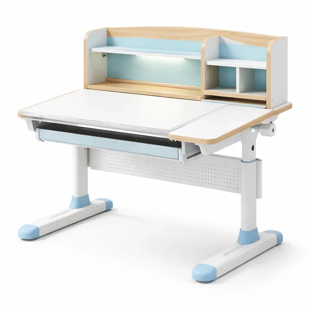 Bureau pour enfant réglable en bois acier et mdf blanc bleu et bois